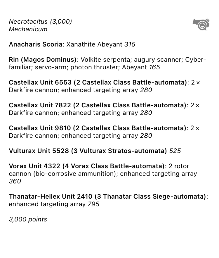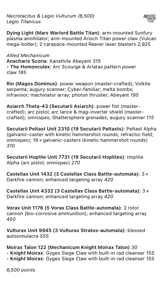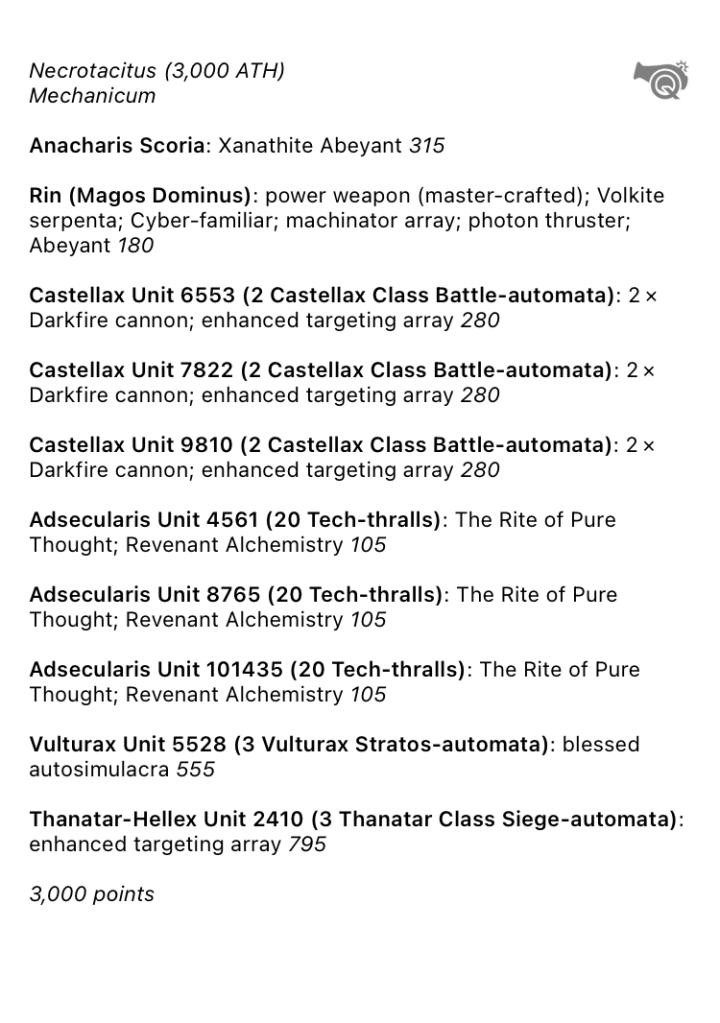 Unlike some of the Mechanicum forces in the region, the Necrotacitus does not have any organic super heavy assets, instead relying on fielding more Battle Automata to overwhelm their foes. When this is unlikely to occur successfully, they can call on their House Ærthegn indentured force to assist them.